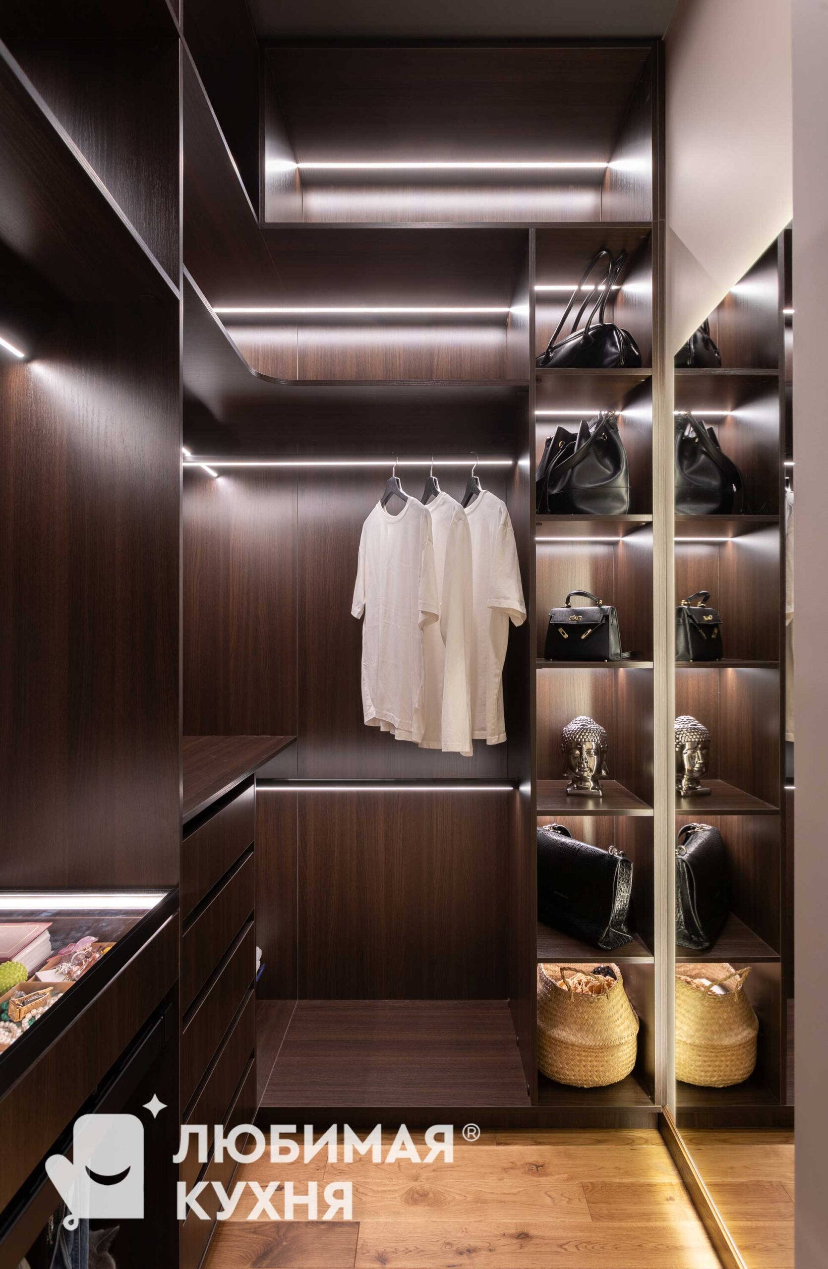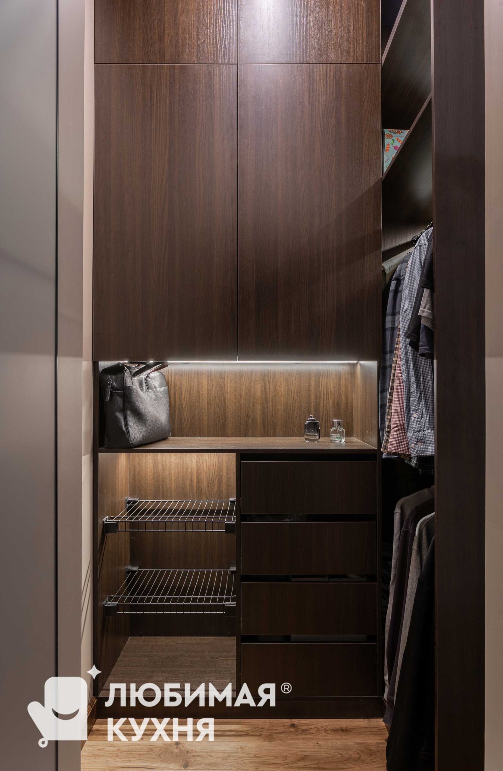 Искусство утонченного минимализма. Темные древесные фасады шкафов создают монолитное пространство, создающее впечатление кулуарного обволакивающего пространства. Гардеробная спроектирована с учетом гардероба заказчика, что позволяет использовать небольшое помещение по максимуму.
