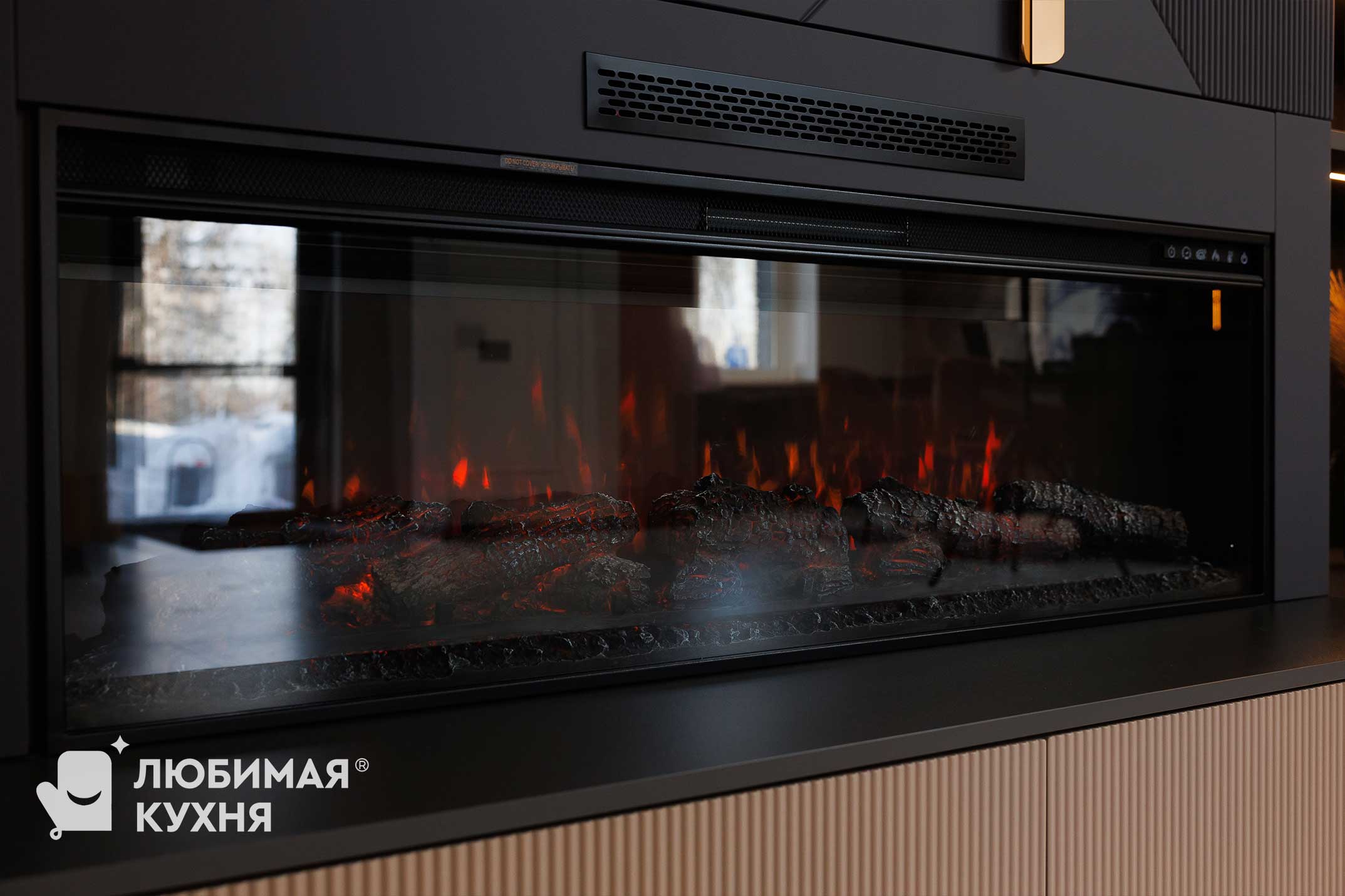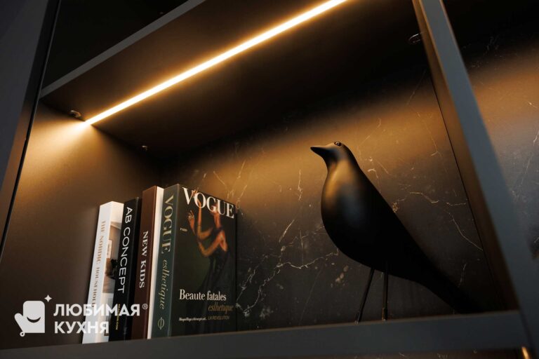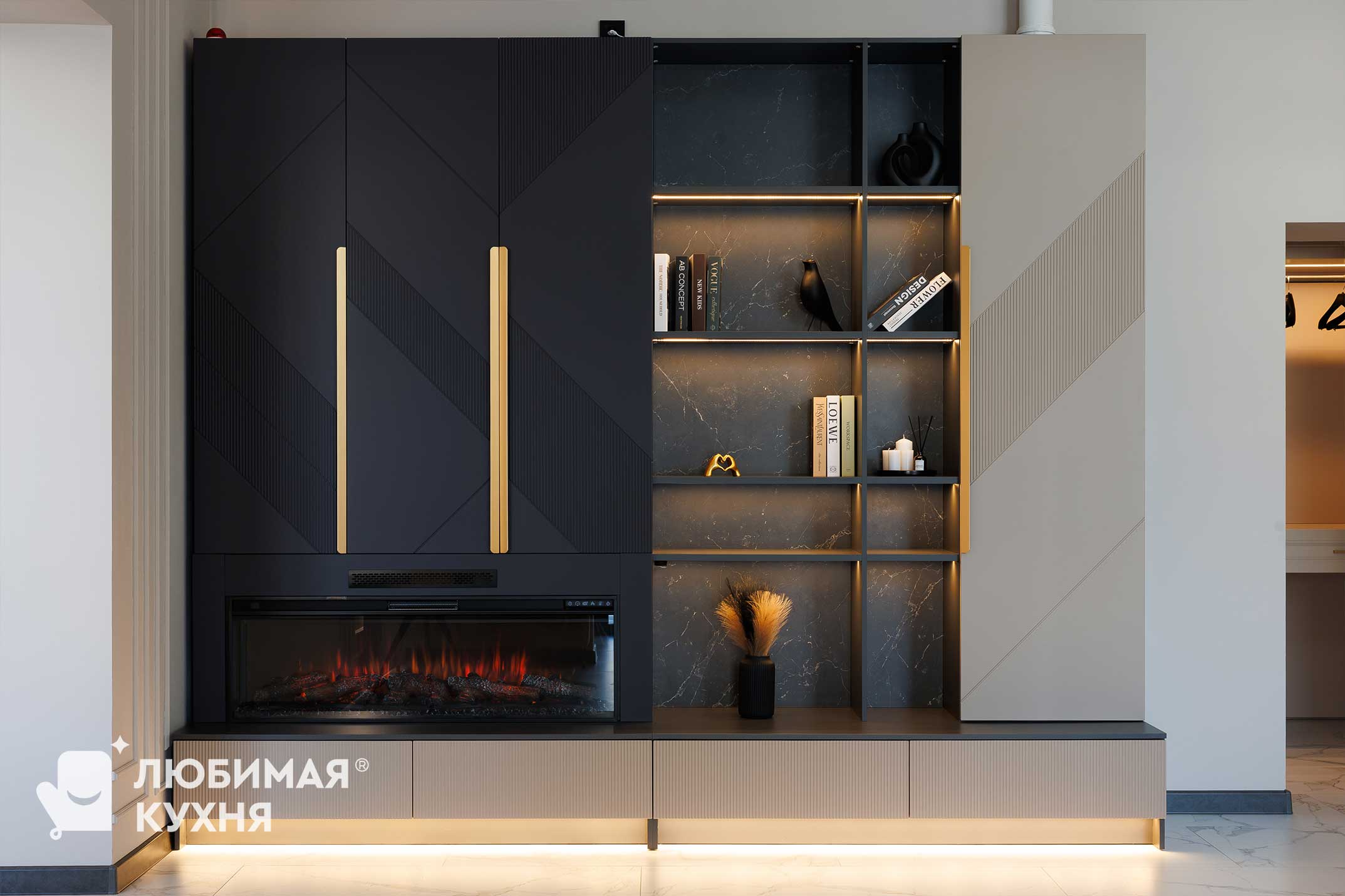 Гостиную в современном стиле с контрастным сочетанием графитового и бежевого оттенков. Фасады шкафов украшены геометрической фрезеровкой и длинными золотистыми ручками. Открытые полки с текстурой мрамора и тёплой подсветкой создают эффектную экспозицию для декора и книг. Встроенный электрокамин с эффектом живого пламени добавляет уюта, а рифленые фасады нижних тумб с подсветкой усиливают ощущение лёгкости. Идеальное решение для хранения и создания атмосферы в современном интерьере.